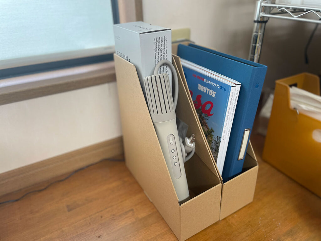 非常にコンパクトなので無印のダンボールスタンドファイルに立ててます。
